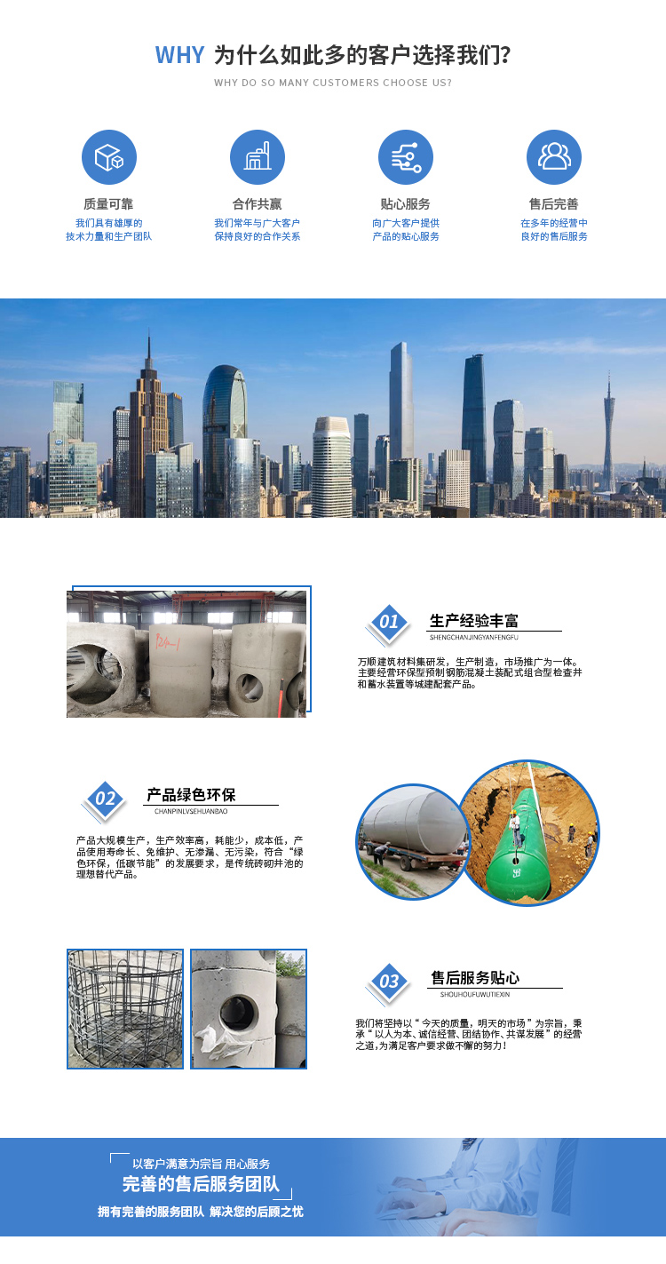 黃山市萬順建筑科技有限公司是集研發(fā),生產(chǎn)制造,市場推廣為一體的綜合性企業(yè)。公司主要經(jīng)營環(huán)保型預(yù)制鋼筋混凝土裝配式組合型檢查井和蓄水裝置等城建配套產(chǎn)品。產(chǎn)品生產(chǎn)過程采用獨特的生產(chǎn)工藝,機(jī)械化流水作業(yè)。產(chǎn)品大規(guī)模生產(chǎn),生產(chǎn)效率高,耗能少,成本低,產(chǎn)品使用壽命長、免維護(hù)、無滲漏、無污染,符合“綠色環(huán)保,低碳節(jié)能”的發(fā)展要求,是傳統(tǒng)磚砌井池的理想替代產(chǎn)品。
